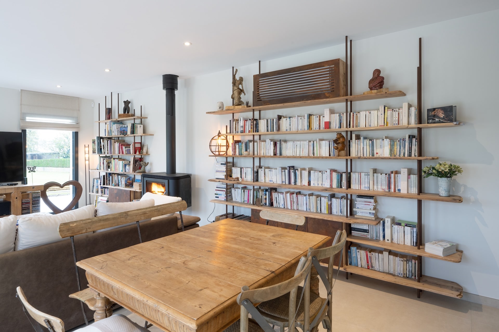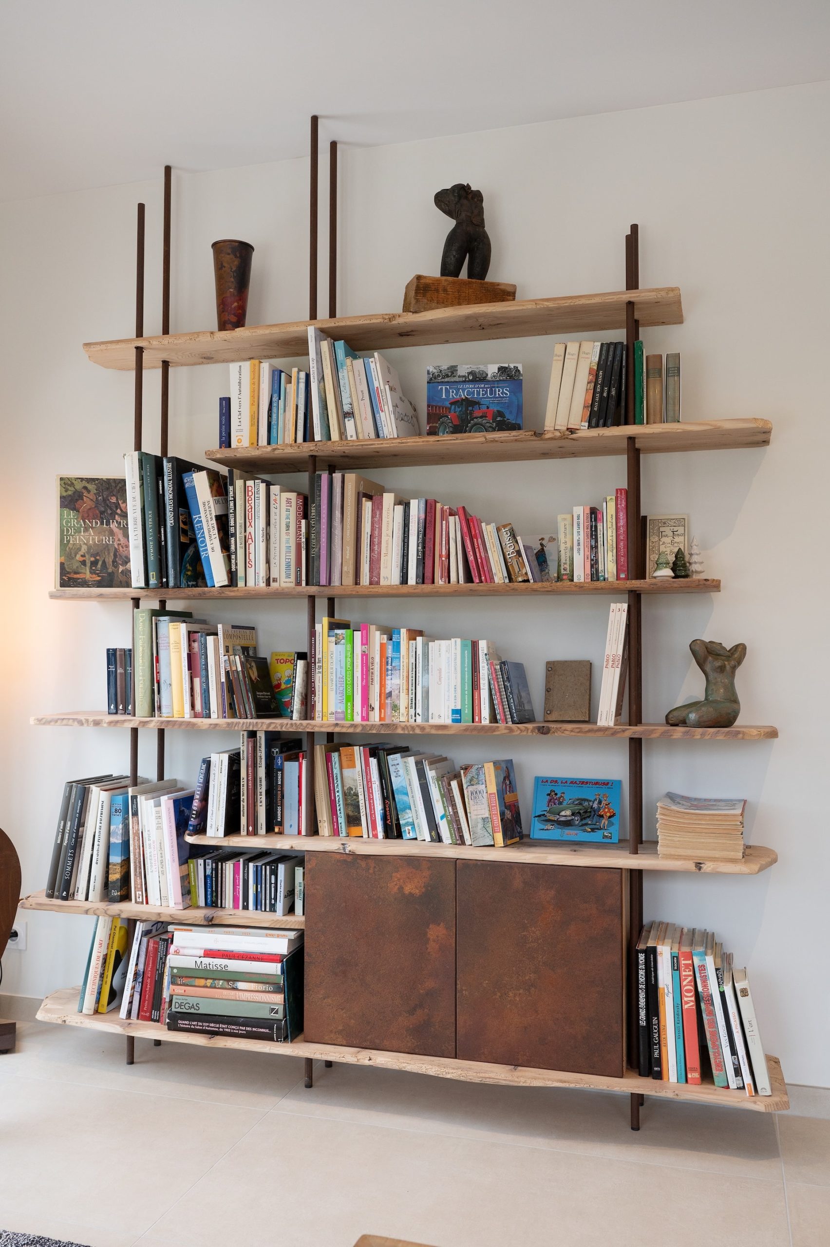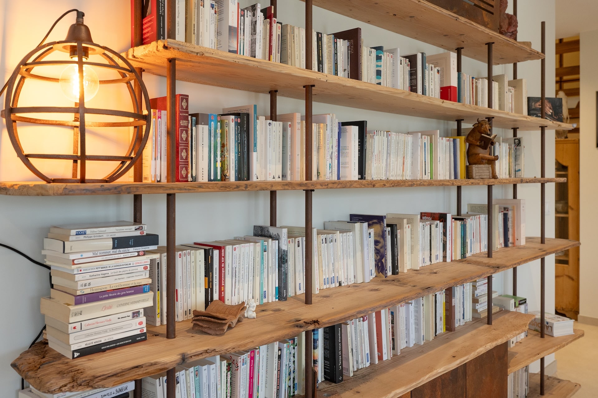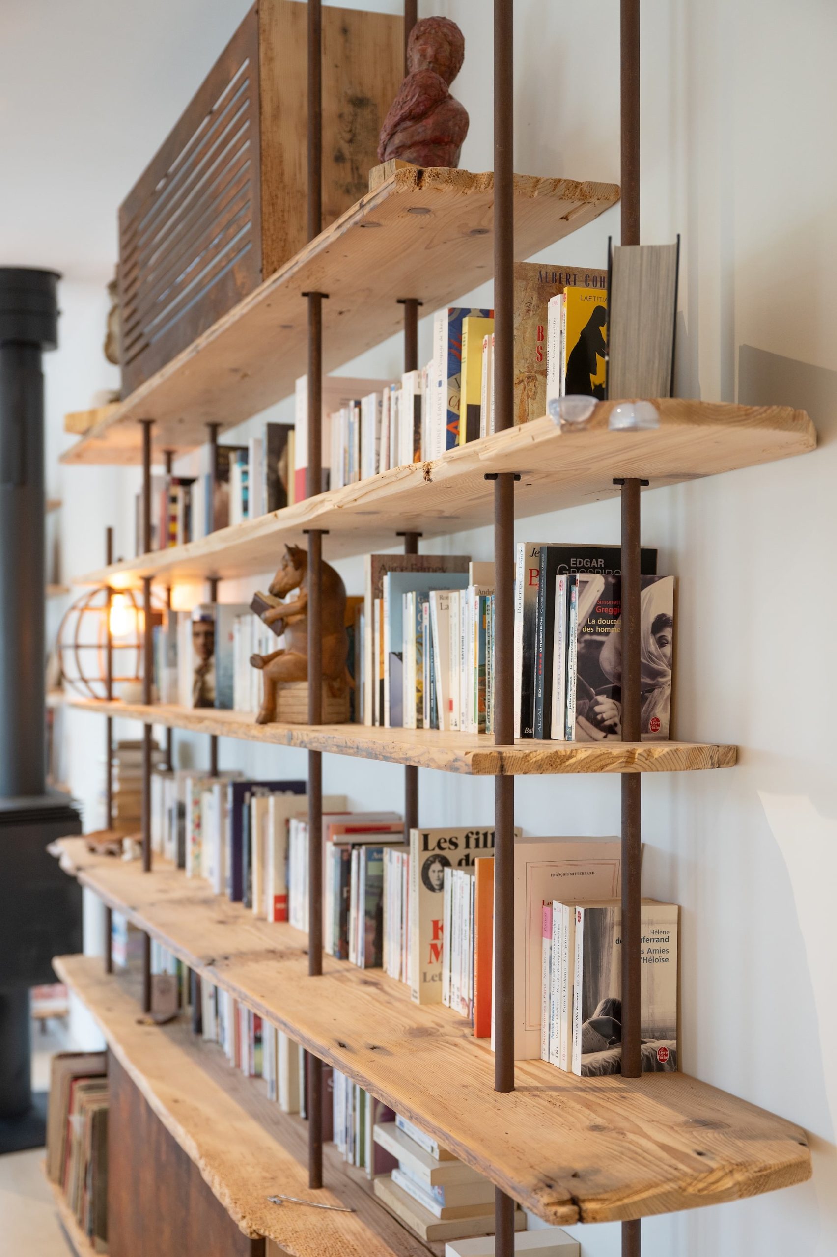 Le caractère distinctif de cette bibliothèque sur mesure réside dans son matériau principal, riche en histoire : le vieux bois de récupération.