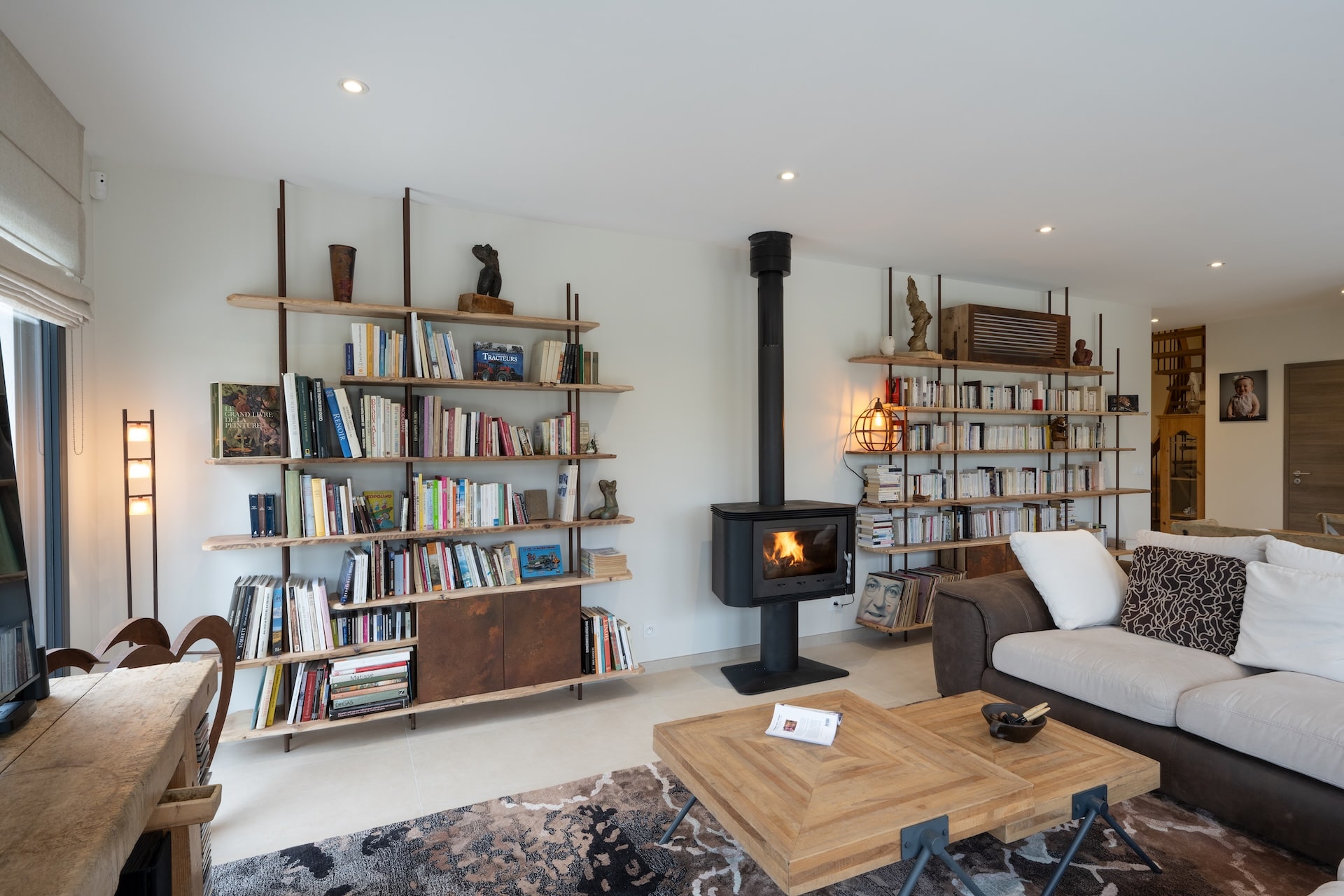 Découvrez notre réalisation la plus ambitieuse de meuble sur mesure : une double bibliothèque minimaliste spectaculaire, conçue pour aménager l’intégralité d’un grand mur de plus de 7 mètres de long. Ce projet, fruit du savoir-faire de notre atelier d’ébénisterie 100 % Made in France (près d’Annecy), incarne la rencontre parfaite entre l’authenticité des matériaux bruts et l’épure du design minimaliste industriel.